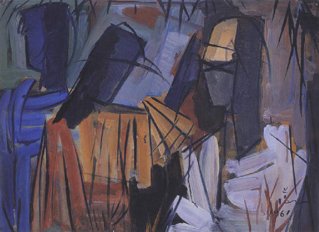 You, He, and Me signed and dated ‘Ying;1961′ in Chinese (lower right) oil on paper and mounted on canvas board